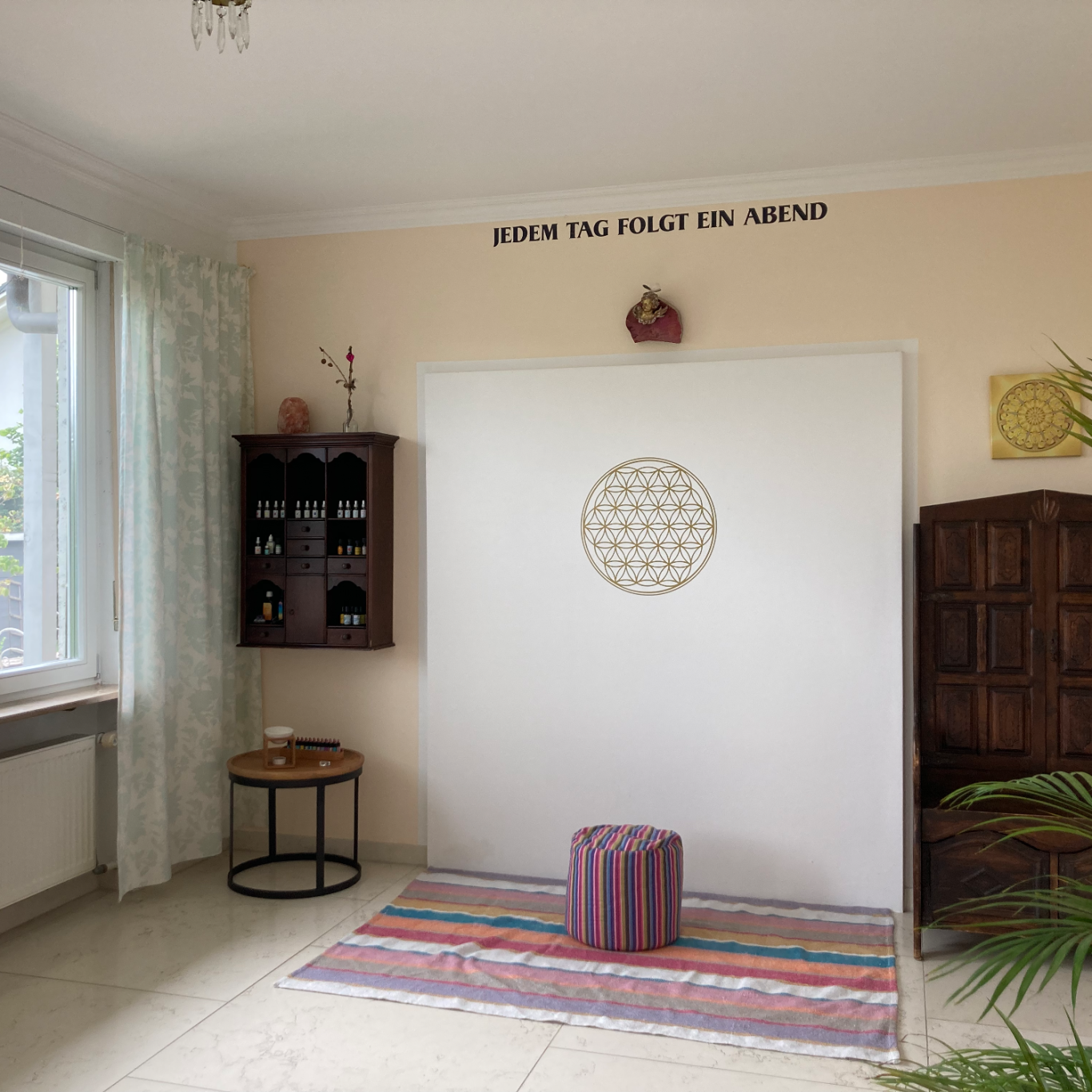 Runder Tisch, Ausziehbar, Stühle, Sitzkissen, variable Einrichtung möglich für Coaching, Meditation, Gespräche u.Ä.